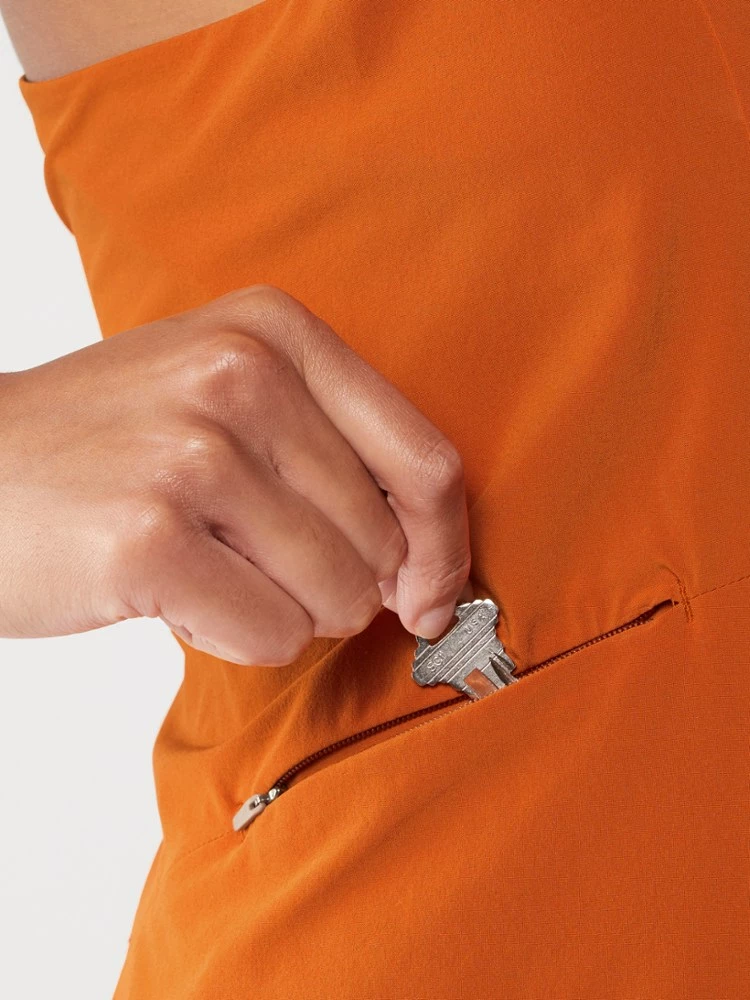 - Secure zip pocket on right side of dress; drop-in phone-size pockets on each thigh of liner
