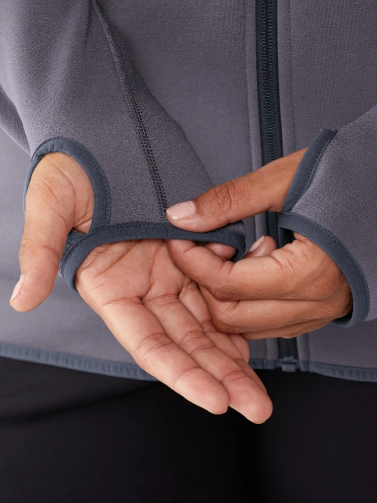- Lycra® spandex binding at the cuffs, hem and hood provides a secure but flexible fit