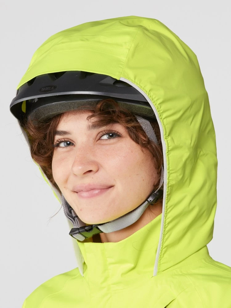 - Hood fits over a bike helmet, adjusts to fit without a helmet and tucks into the collar when you don’t need it