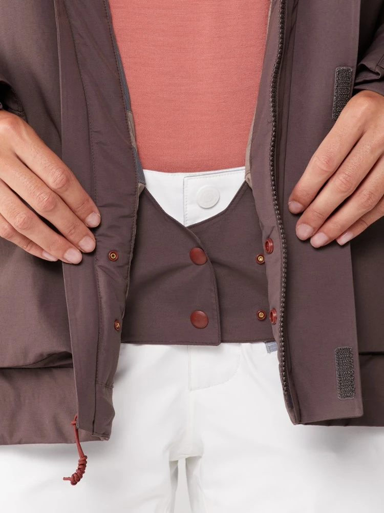 - Powder skirt snaps away when not needed; drawcord at hem helps seal out the elements