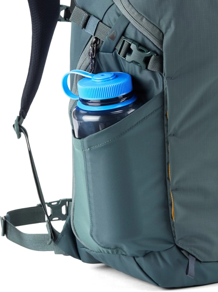- Access ports on both sides of the pack accommodate a hydration reservoir tube (reservoir not included)