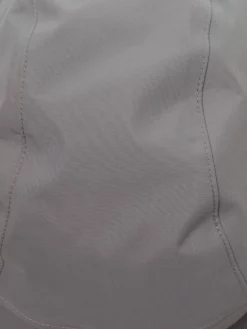 - Brim is longer in back for neck coverage; one side of crown folds up and snaps in place