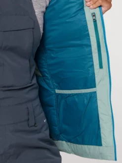 - Both down and synthetic insulation is mapped to the body, providing warmth where it’s needed and reduced bulk where it’s not