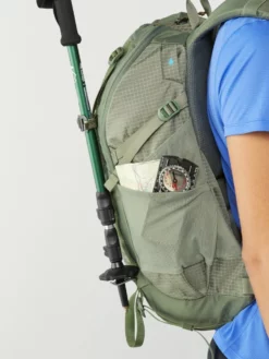 - Special fasteners on the back hold trekking-pole tips down low and pole shafts up high